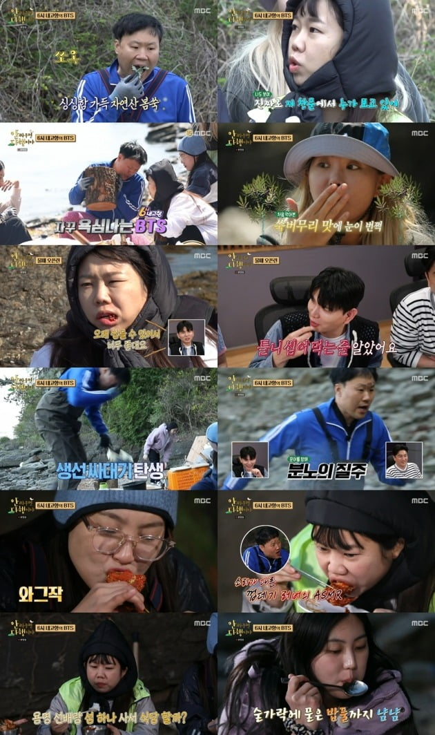 이어 다시 물때 오픈런에 도전한 이들은 가는 스폿마다 새로운 해산물을 발견하며 수족관을 채워갔다. 그중 신상 멍게를 획득한 홍현희는 즉석에서 ‘멍게 껍데기’ 먹방을 선보여 모두를 놀라게 했다. 제이쓴은 “처음에는 틀니 씹어 먹는 줄 알았다”고 말하면서도 홍현희를 꿀 뚝뚝 떨어지는 눈빛으로 바라봐 애정을 과시했다.