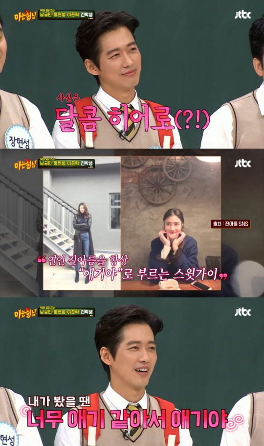 남궁민은 ‘아는 형님’에 최근 종영한 드라마 ‘닥터 프리즈너’에 출연한 배우 장현성, 이준혁과 함께 게스트로 나왔다. 서장훈이 “남궁민이 다크히어로로 나왔지만 사실 ‘달콤히어로'”라면서 “사랑하는 사람에게 ‘애기’라고 한다더라”고 말했다. 이에 남궁민은 웃으며 “맞다”고 말했다. 그는 여자친구인 진아름에 대해 “내가 봤을 때는 너무 애기 같아서 애기라고 한다”고 애정을 과시했다.