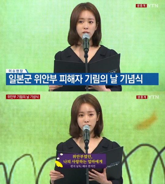한지민은 이날 서울 효창동 백범김구기념관에서 열린 ‘일본군 위안부 피해자 기림의 날 정부 기념식’에 참석해 ‘위안부였던, 나의 사랑하는 엄마에게’라는 제목의 편지를 읽었다. 해당 편지는 2명 이상의 유족을 인터뷰한 내용을 바탕으로 완성된 것으로 알려졌다.