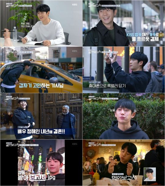 정해인과 그의 절친 배우 은종건-임현수의 별천지 뉴욕 여행기를 ‘정해인의 걸어보고서’는 KBS1 ‘걸어서 세계속으로’를 예능으로 재 탄생시킨 프로그램으로 단순한 여행 리얼리티가 아닌, 걸어서 여행하고 기록하는 일명 ‘걷큐멘터리’. 지난 26일에 첫 방송된 ‘정해인의 걸어보고서’에서는 정해인이 ‘여행 다큐 피디’로서 꿈의 도시 뉴욕에 입성, 다사다난한 첫째 날을 보내는 모습이 그려졌다.
