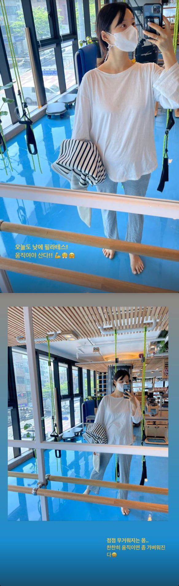 한지혜는 21일 자신의 인스타그램 스토리에 "오늘도 낮게 필라테스! 움직여야 산다!", "점점 구어워지는 몸. 찬찬히 움직이면 좀 가벼워진다"라는 글과 함께 사진을 올렸다. 사진 속 한지혜는 필라테스 센터에서 편안한 차림으로 운동을 한 모습이다. 오버핏 티셔츠 위로 드러난, 제법 볼록해진 배가 눈에 띈다.