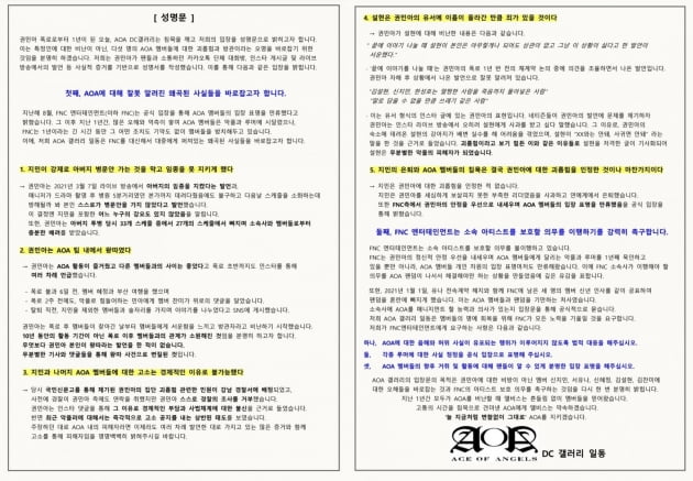 FNC를 향해선 "소속 아티스트를 보호할 의무를 이행하기를 강력히 촉구한다"고 했다. 그러면서 AOA에 대한 허위 사실 유포 행위에 대해 법적 대응과 각종 루머에 대한 공식 입장을 표명해달라고 요구했다.