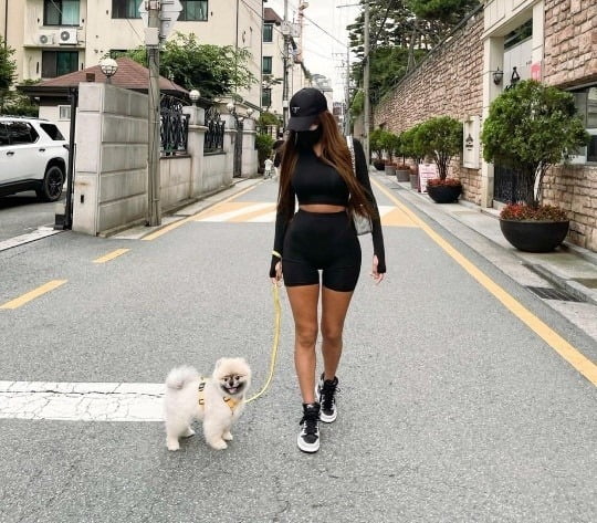 사진 속 제시는 머리부터 발끝까지 블랙으로 차려입은 채 반려견의 리드줄을 잡고 있다. 특히 몸에 초밀착된 상의와 하의가 그의 완벽한 콜라병 몸매를 돋보이게 만든다.