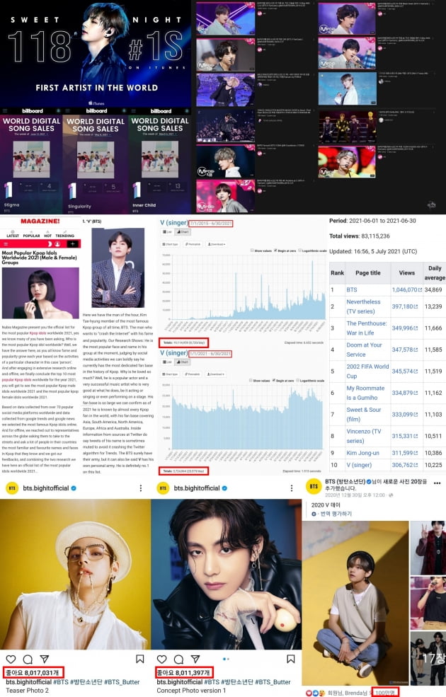 방탄소년단 계정 좋아요 순위 1, 2위가 모두 뷔의 사진일 정도로 압도적인 인기를 자랑하며, 한국 남자 연예인 최초의 500만, 600만, 700만, 800만 '좋아요' 기록을 연이어 돌파했다.