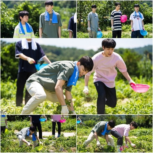 극중 '라켓소년단' 윤해강(탕준상 분)-방윤담(손상연 분)-나우찬(최현욱 분)-이용태(김강훈 분)와 박찬(윤현수 분), 오재석(정택현 분)이 한손엔 바구니, 한손엔 호미를 들고 드넓은 밭 앞에 서서 망연자실 표정을 짓고 있는 장면.