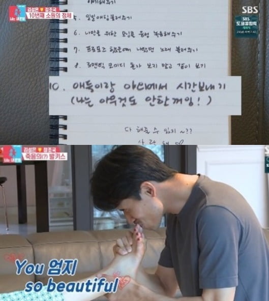 김성은의 버킷리스트에는 '발마시지와 페디큐어 후 발에 키스하기', '일일 애칭 불러주기', '나말을 위한 모닝콜 음성 녹음해주기'. '애들이랑 야외에서 시간보내기' 등이 있었다.