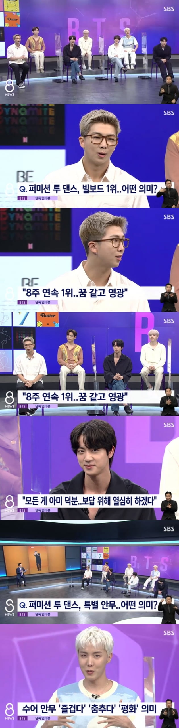 김용태 앵커는 방탄소년단에게 "빌보드 7주 연속 정상을 차지한 것도 대단한데, 8주 째에 1위를 밀어내고 배턴 터치를 했다. 축하한다"라고 인터뷰 포문을 열었다. 방탄소년단은 'Butter'에서 'Permission to Dance(퍼미션 투 댄스)'로 빌보드 메인 싱글차트 핫100로 8주 연속 1위를 기록하고 있다.