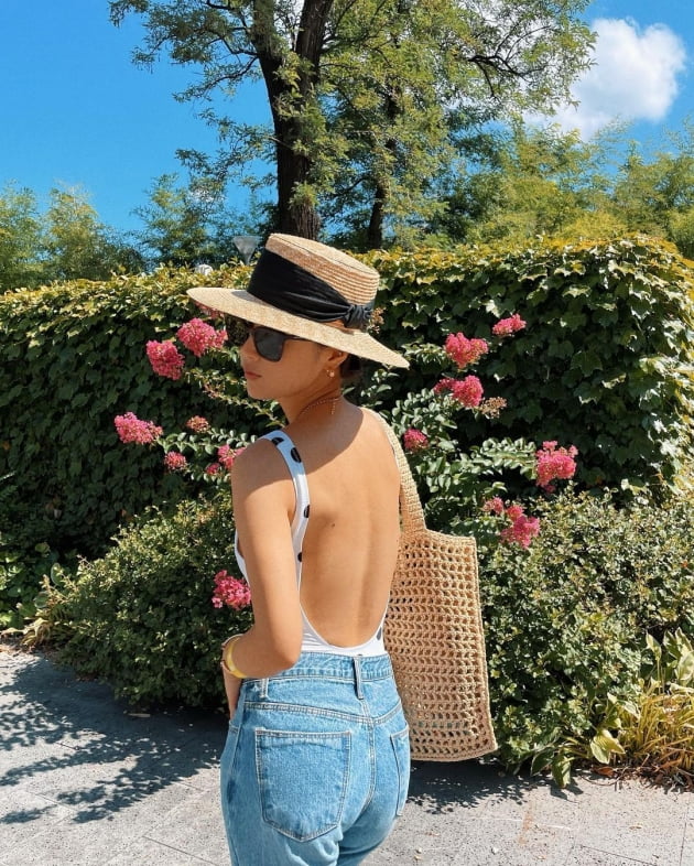 기은세는 10일 자신의 인스타그램에 "#ootd #kiootd"라는 글과 함께 사진을 올렸다. 사진 속 기은세는 명품브랜드 P사의 151만원짜리 라피아 토트백에 비슷한 소재의 모자를 쓰고 선글라스로 멋을 냈다. 검정 도트 무늬가 있는 원피스 수영복을 티셔츠 대신 착용하는 패션 센스가 돋보인다. 여기에 청바지를 매치해 청량한 여름룩을 완성했다. 자신감 넘치는 애티튜드와 늘씬한 몸매는 눈길을 사로잡는다.