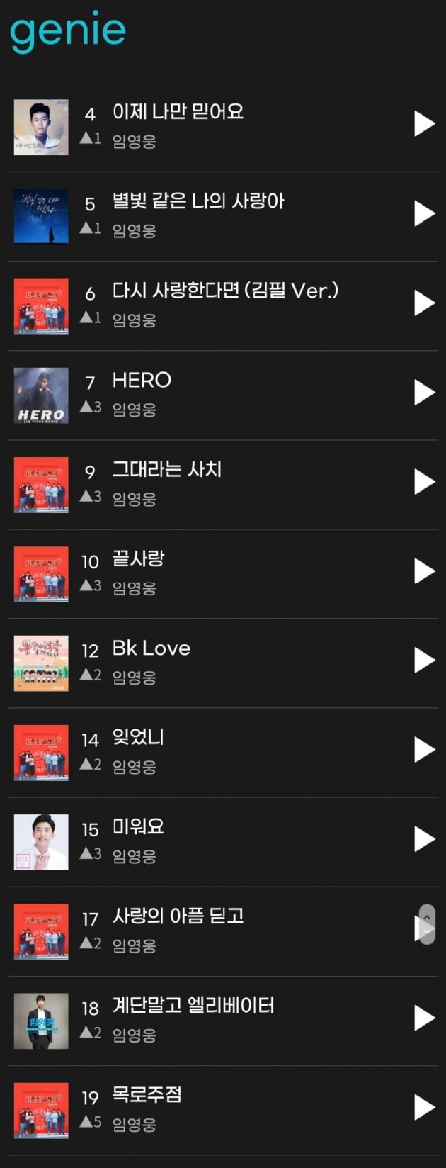 음원 사이트 지니(genie)에 따르면 19일 오전 7시 톱100 차트에는 12곡의 임영웅 노래들이 이름을 올렸다.