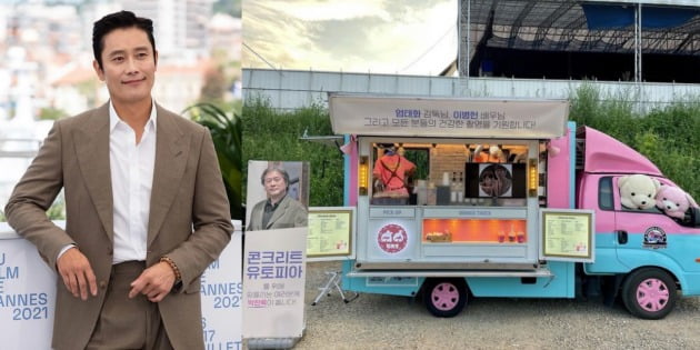 이병헌은 19일 자신의 인스타그램에 "커피차 보내시면서 본인사진을 이렇게 크게...; 잘 마실게요. 고맙습니다! #박찬욱감독님 #콘크리트유토피아 #concreteutopia"라는 글과 함께 사진을 게재했다.