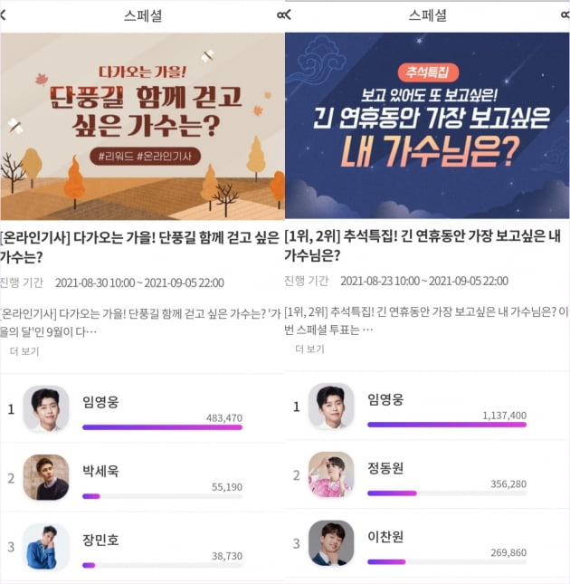 트롯스타 투표 웹서비스 ‘트롯픽’(trotpick)은 지난 23일부터 5일까지 진행된 스페셜 투표 결과를 공개했다. 투표 결과 ‘추석특집, 긴 연휴동안 가장 보고싶은 내 가수님은?’ 부문에서 임영웅이 113만 7400포인트로 1위에 올랐다. 2위에는 35만 6280표로 정동원이, 3위는 26만 9860표로 이찬원이 각각 차지했다. 이번 투표를 통해 많은 팬들이 임영웅을 그리워 하는 마음이 드러났다.