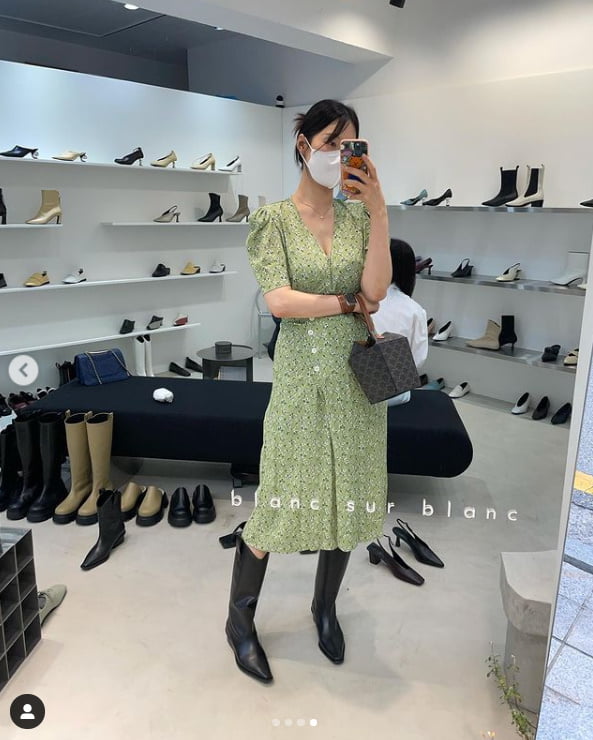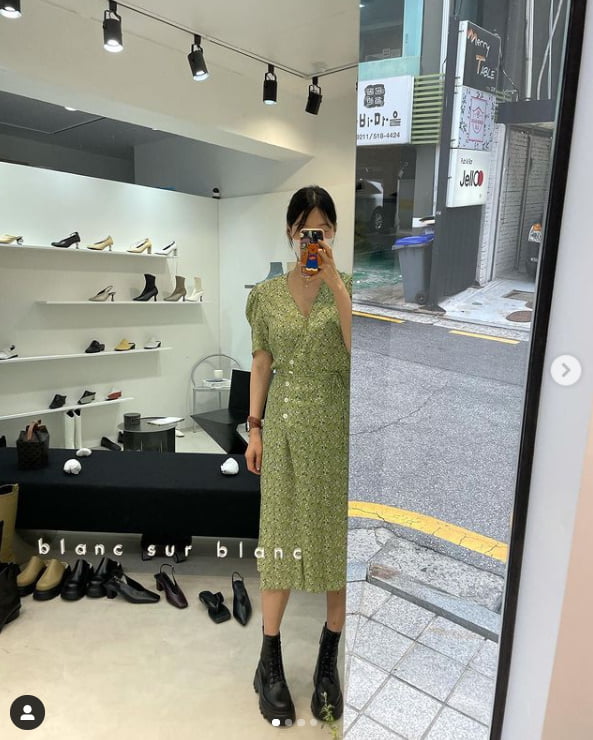 공개된 사진 속 한지혜는 초록색 원피스를 입고 화사한 분위기를 자아낸다.