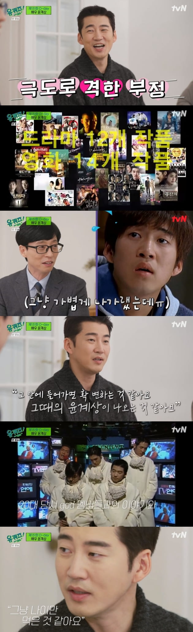 17일 오후 방송된 tvN '유 퀴즈 온 더 블럭'에는 배우 윤계상이 출연했다. 윤계상은 다소 긴장한 모습으로 유재석, 조세호와 만났다. 유재석은 "더 멋있어졌다"라며 오랜만에 만나 반가운 인사를 나눴다. 유재석은 과거 윤계상의 재치에 대해 전했고, 윤계상은 "god에서 내 담당은 개그였다"라고 말했다.