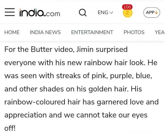 매체는 '버터 뮤직비디오에서 선보인 지민의 새로운 레인보우 헤어(rainbow hair)로 모두를 놀라게 했다'며 공개 당시 폭발적 반응의 화제를 모았던 지민의 헤어스타일에 대해 소개했다.