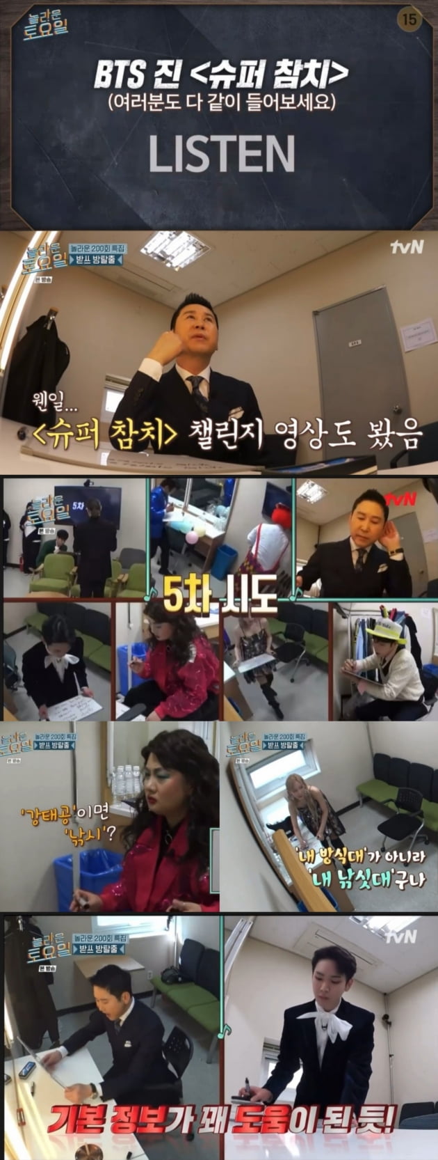 특히 출연자 중 신동엽은 "나 이 노래 아는데"라며 미국 유치원생 어린이들이 진을 따라 "참치!"라고 외치는 '슈퍼참치' 챌리지 영상을 봤다고 밝혔다.