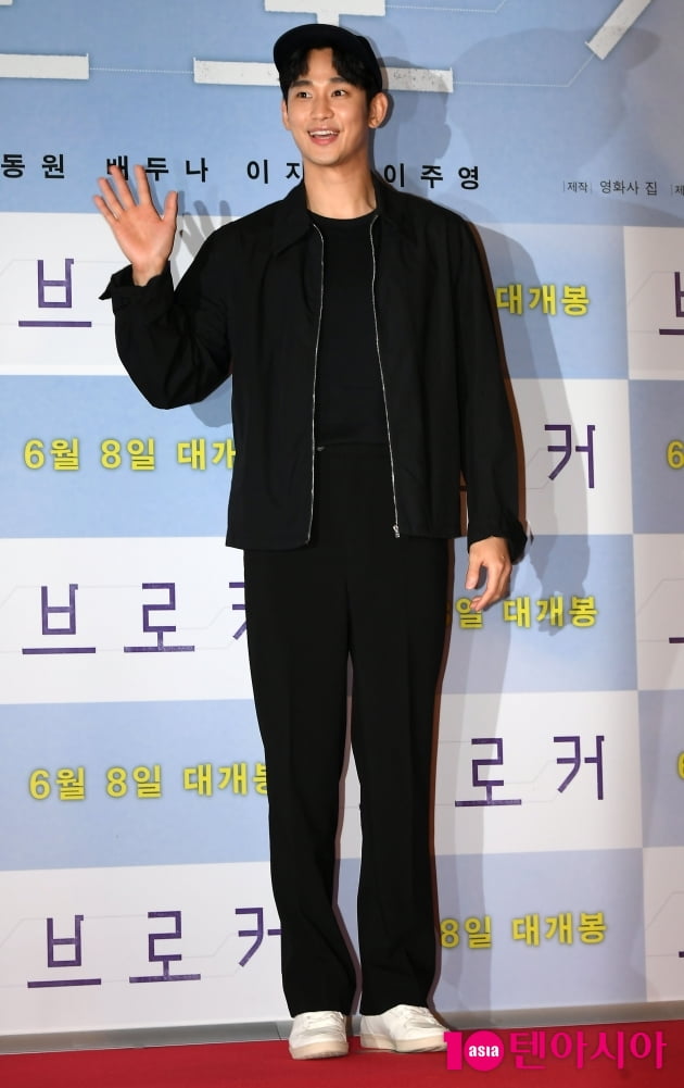 배우 김수현이 2일 오후 서울 용산구 한강로 CGV용산아이파크몰에서 열린 영화 '브로커' VIP시사회에 참석하고 있다.