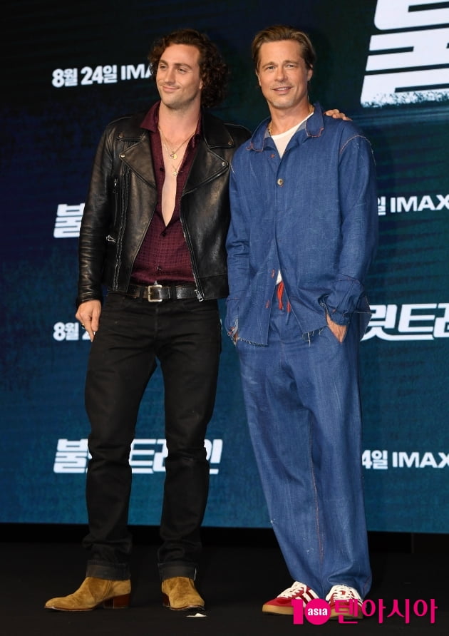 헐리우드 배우 애런 테일러 존슨(Aaron Taylor Johnson)와 브래드 피트(Brad Pitt)가 19일 오전 서울 영등포구 콘래드 서울에서 열린 영화 <불릿 트레인> 내한 프레스 컨퍼런스에 참석해 포즈를 취하고 있다.