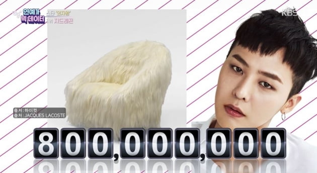 카니예 웨스트가 고급 세단을 팔고 구입한 의자, 제니퍼 애니스톤이 구입한 집보다 비싸다고 한 의자가 지드래곤의 집에도 있는데 프랑스 디자니어 장 로이에가 디자인했으며 경매로만 구입할 수 있다고. 이 소파의 가격은 11억.