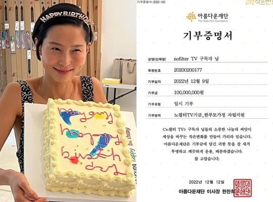 김나영은 12일 "이번 기부도 노필터 티비의 구독자 여러분들이 해주신 거에요. 제가 아름다운 재단에 잘 전달했습니다"라며 기부 사실을 알렸다.