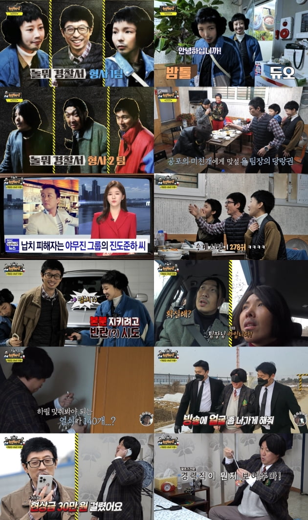 이날 ‘놀뭐 경찰서’ 형사 1팀 유 팀장(유재석)·재식이(이미주)·진철이(박진주)는 까까머리로 헤어스타일을 통일한 모습으로 등장해 눈길을 끌었다. 특히 기합이 바짝 들어간 진철이와 재식이 ‘밤톨형제’는 망가짐도 불사한 변장으로 폭소를 안겼다. 형사 2팀 윤개상(하하), 미친개(신봉선), 석구(이이경)는 형사인지 범죄자인지 모를 비주얼로 기선을 제압했다. 석구는 진철이와 재식이를 향해 “새끼 독수리가 여기 앉아 있냐”라며 견제했고, 양 팀은 먹는 것부터 신경전을 벌이며 대치했다.