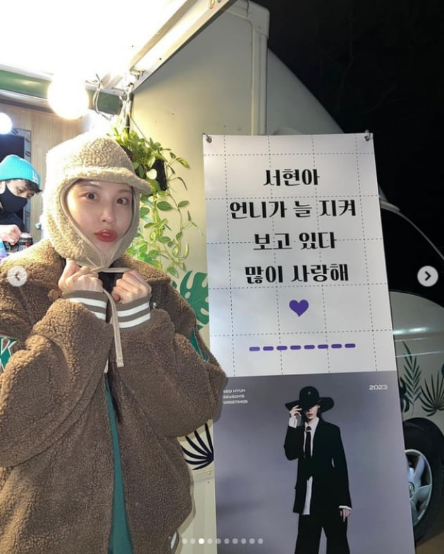 사진 속 서현은 태연에게 선물 받은 커피차 앞에서 인증샷을 찍고 있다.