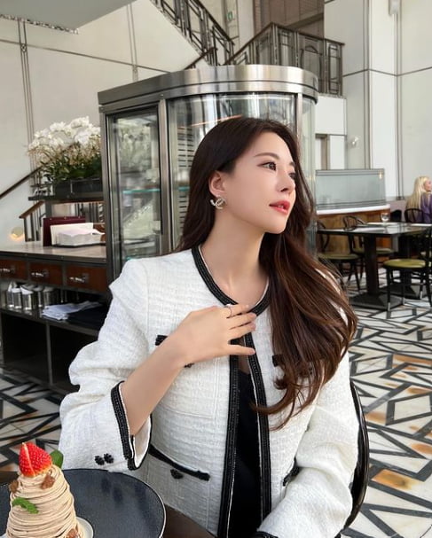 최근 김민영은 "밥은 안먹어도 디저트는 먹는 설탕중독자 ⭐️ 오늘룩은 블랙앤화이트👸🏻"라는 글과 함께 사진을 게재했다.