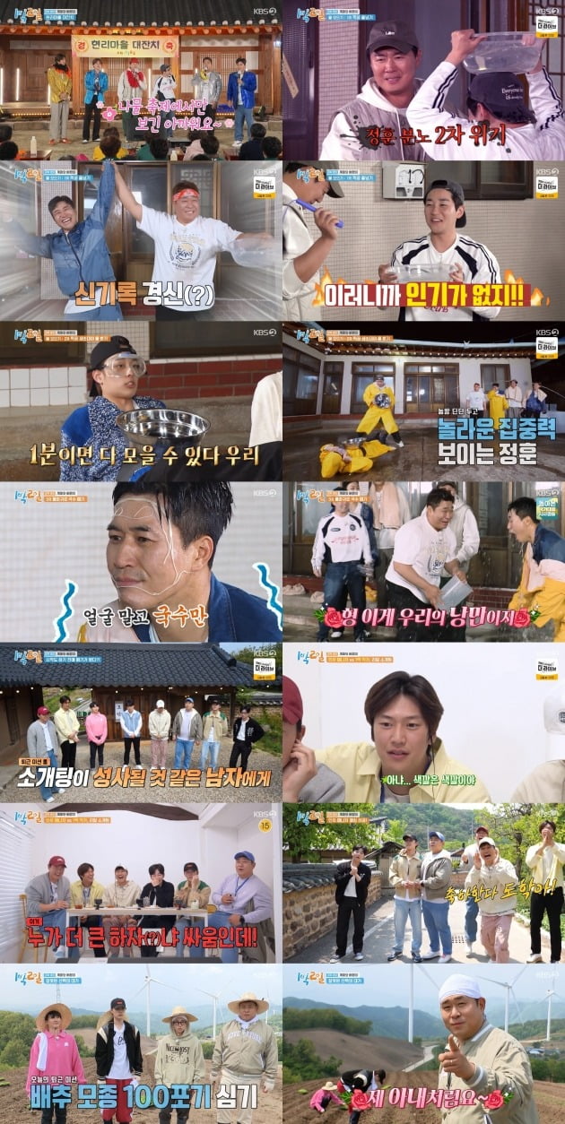 여섯 멤버들은 앞에서 모은 물로 최종 게임인 ‘물따귀로 국수 떼기’에 임했다. 물 부자였던 연정훈과 딘딘은 손쉽게 성공했고, 나인우와 유선호는 유약한 물줄기로 인해 야외 취침이 확정됐다.