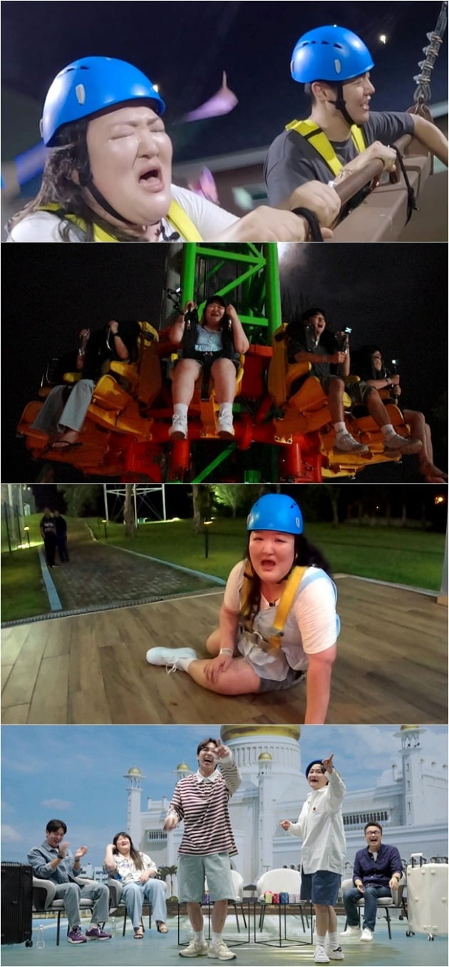 이날 방송에서는 이국주와 채코제의 브루나이 대리 여행기가 담기는 가운데, 두 사람의 버라이어티한 브루나이 놀이기구 탑승기가 공개돼 이목을 끈다. 공개된 스틸 속 이국주의 눈가에는 눈물인지 땀인지 알 수 없는 액체가 흐르고 있어 시선을 강탈한다. 힘껏 소리 지르는 이국주와 다르게 채코제는 여유롭게 미소를 띤 모습.