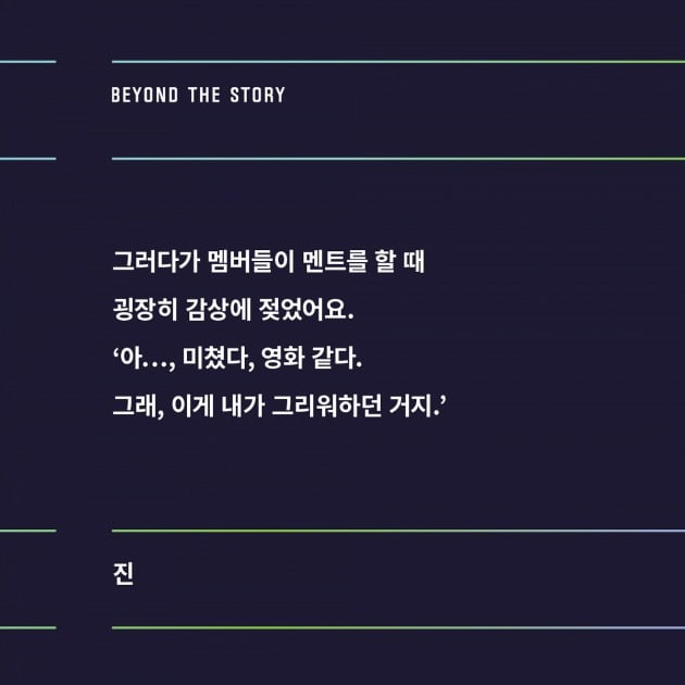 제이홉은 “서로 이야기를 진짜 많이 했어요. ‘우리는, 나는, 이런 목표가 있어. 너희는 어때? 같이 해 보지 않을래?’”라고 전한다. 지민은 “아직도 저는 방송 카메라 옆에 있던 그 단 한 줄을 기억해요”라고 한다. 뷔는 “제가 먼저 행복해지고 에너지를 받아야, 그런 사람이 되는 데에 한 걸음씩 가까워질 수 있다고 생각해요”라고 말한다. 정국은 “정말로 그렇게 될 수도 있을 것 같다고 느낀 순간이었어요. ‘무언가 더 있을 것이다’라고 느끼게 된 순간”이라는 코멘트를 남겼다.