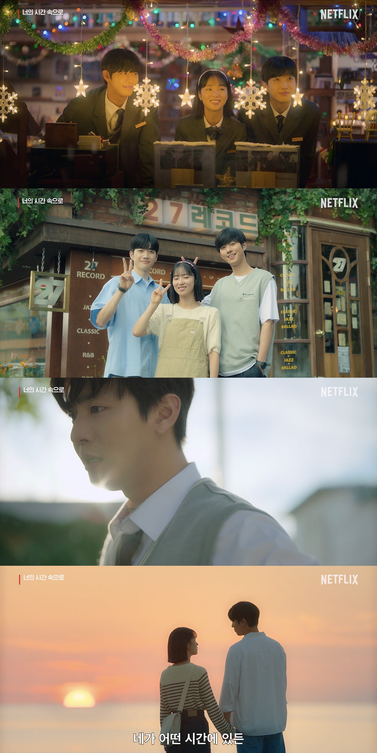 24일 넷플릭스는 '너의 시간 속으로' 메인 포스터와 예고편을 공개했다. '너의 시간 속으로'는 1년 전 세상을 떠난 남자친구를 그리워하던 준희(전여빈 역)가 운명처럼 1998년으로 타임슬립해 남자친구와 똑같이 생긴 시헌(안효섭 역)과 친구 인규(강훈 역)를 만나고 겪게 되는 미스터리 로맨스.