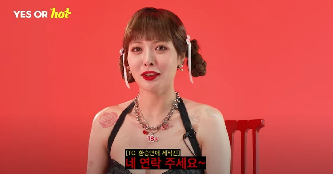 현아는 최근 유튜브 'TEO'의 전소미가 진행하는 'Yes or Hot'에 출연했다. 전 연인과 함께 출연해야 하는 연애 프로그램인 '환승연애'에 나갈 의향이 있냐 묻자 "예스"라고 답하며 "(환승연애 제작진) 연락주세요"라고 능청스럽게 이야기했다.