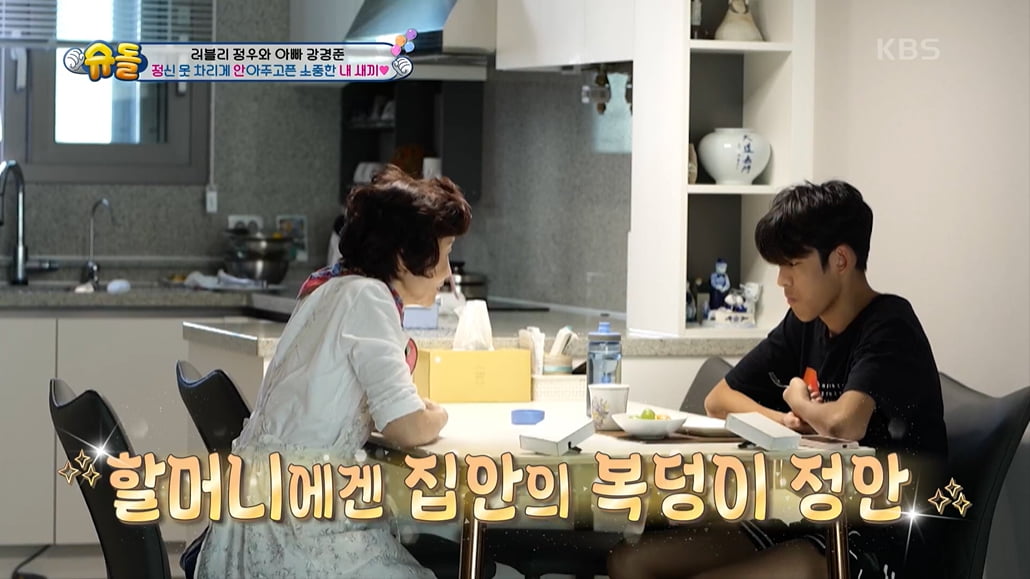 아들 강경준과 며느리 장신영이 결혼하면서 강경준 어머니는 정안이가 10살이던 시절에 처음 만났다. 강경준 어머니는 "정안이는 마음으로 품은 내 손자다. 혈육 관계보다 더 마음이 가고, 내가 신영이를 받아들일 때 정안이까지 같이 온 거다. 내 새끼"라며 각별한 마음을 표했다. 또한 "정안이가 할머니와 살겠다고 해서 행복하다. 복덩이다"라고 말했다. 정안도 할머니의 사랑에 보답하듯 열일곱 남고생답지 않은 붙임성으로 흐뭇함을 자아냈다.