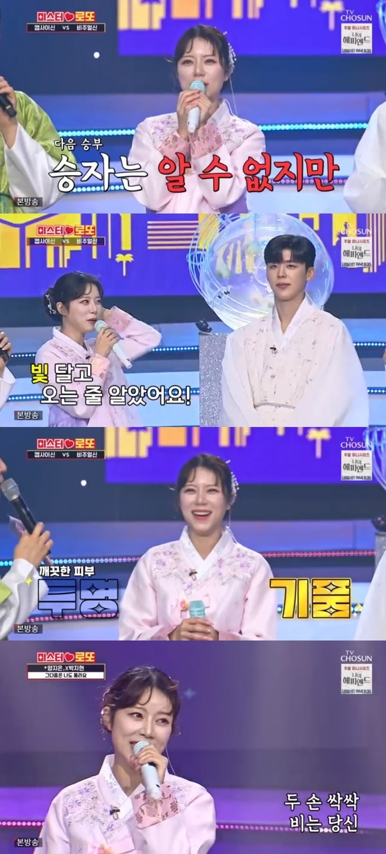 ‘미스터로또’ 방송 사상 최초로 2인 1조 팀 토너먼트 대결로 꾸며진 가운데, 양지은은 박지현과 ‘비주얼 신’ 팀으로 뭉쳤다. ‘미스트롯2’ 진(眞) 양지은과 ‘미스터트롯2’ 선(善) 박지현의 특급 컬래버레이션 성사에 출연진들은 감탄을 연발했다.