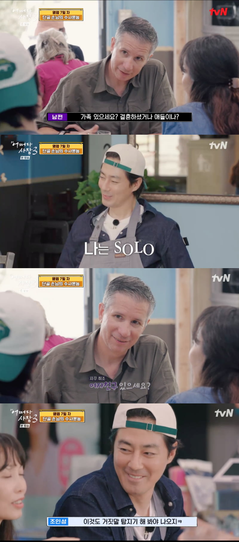 손님이 조인성에게 "집에서 요리하는 거 좋아하세요?"라고 묻자 조인성은 "가끔 한다. 매우 피곤하다"라고 대답했다. 이어 부부 손님은 계속 조인성에게 질문을 이어갔다. 손님은 "제일 좋아하는 음식은? 한국 어디에서 오셨어요?"라고 물었다. 알고 보니 손님은 한국에서 근무를 한 적이 있었던 것. 조인성이 직업에 대해 질문하자 손님은 "군대에서 수사관으로 일해요"라고 직업을 밝혔다.