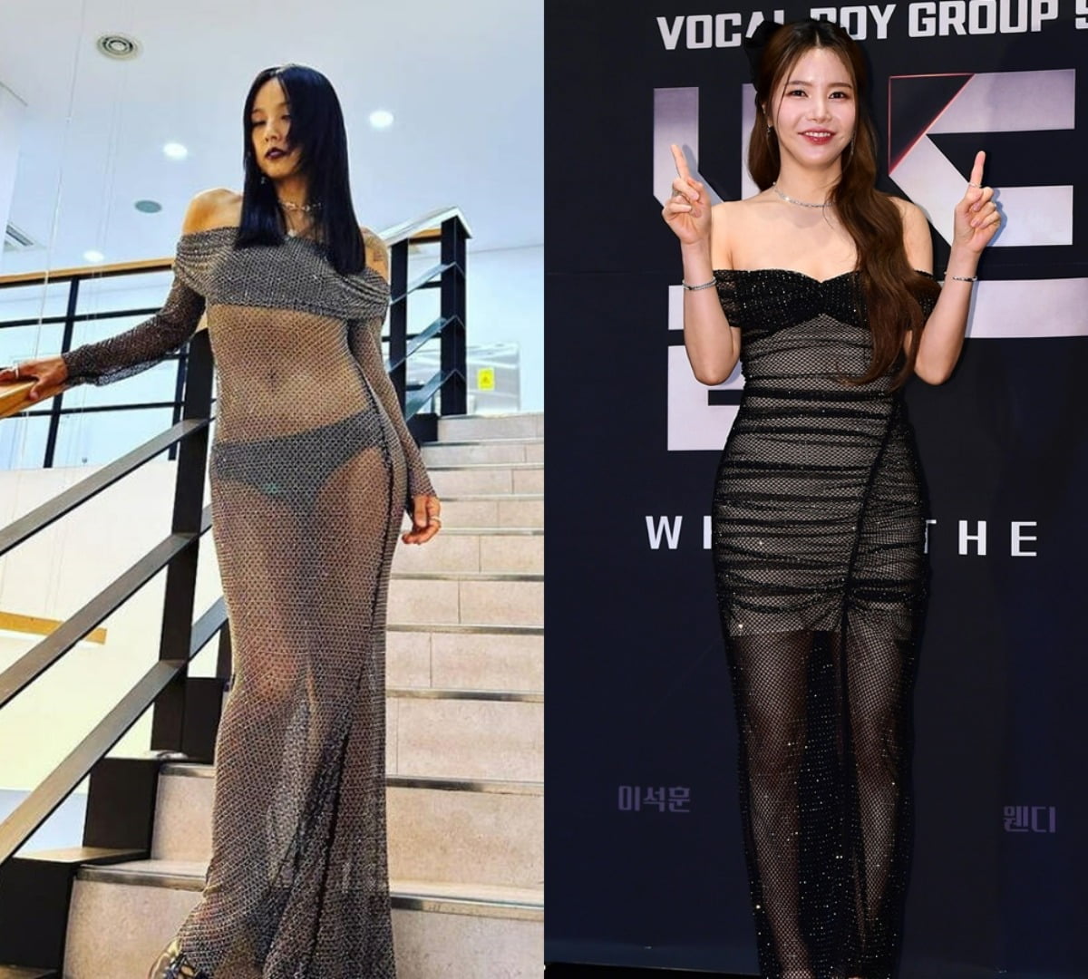 이날 솔라는 오프숄더 시스루 원피스를 입고 등장해 시선을 사로잡았다. 빛나는 장식의 망사 원단과 허벅지 기장의 미니 드레스로 팔뚝살을 잡아주는 오프숄더 디자인, 각선미가 돋보이는 실루엣이 포인트다. 가격은 400유로로, 한화 약 18만원대로 알려졌다.