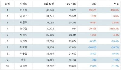 트렌드 지수 1위 이준혁의 빅데이터 조사한 결과, 이준혁 서울의 봄, 이준혁 빙의 글, 이준혁 나무위키, 이준혁 이진욱, 이준혁 사주 등이 주목받는 관련 검색어로 나타났으며 2위 손석구는 손석구 전종서, 손석구 드라마, 손석구 패딩, 손석구 영어, 손석구 동생, 3위 나인우는 나인우 군대, 나인우 1박2일, 나인우 공명, 나인우 보아, 나인우 정체 등으로 나타났다.