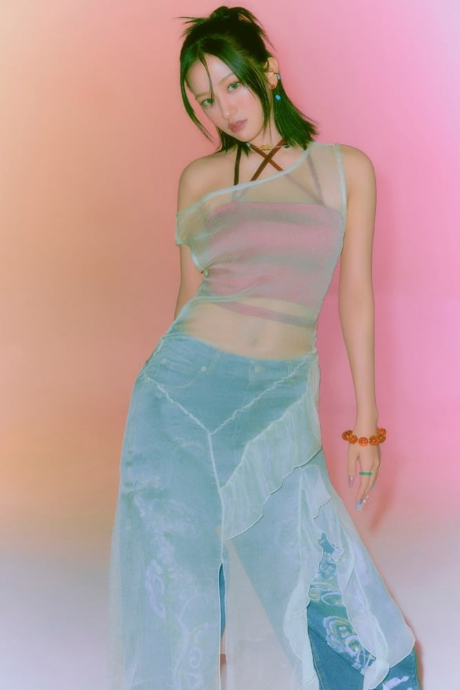 단발 반묶음 헤어스타일로 시크한 매력을 보인 안유진은 동양적인 무늬 패턴의 데님 팬츠와 시스루 원피스, 크롭 상의를 레이어드하며 과감하면서도 동양적인 요소를 가미시킨 패션을 선보였다. 흐트러짐 없는 안유진의 비주얼은 물론, 신비로운 분위기를 뿜어내 시선을 사로잡았다.