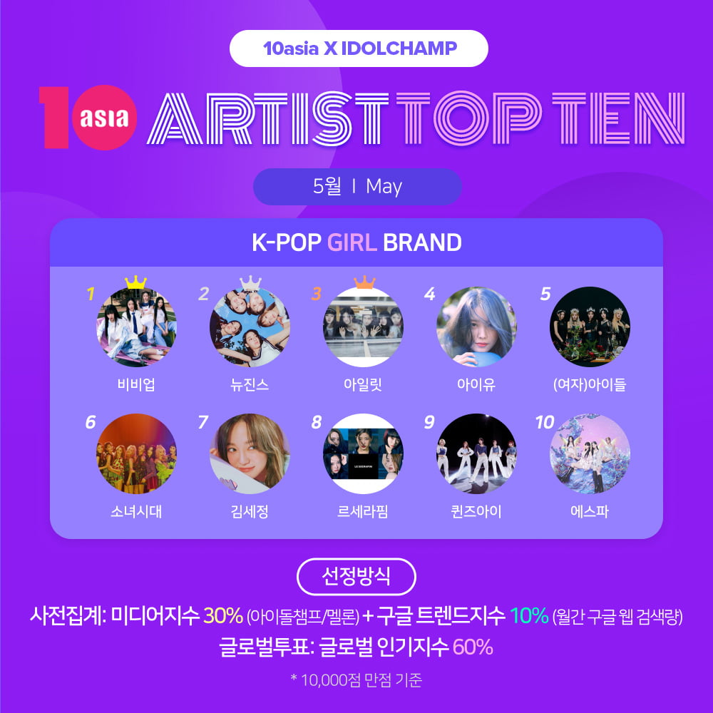 비비업, 뉴진스, 아일릿, 아이유, (여자)아이들, 소녀시대, 김세정, 르세라핌, 퀸즈아이, 에스파의 순위는 온라인 음원 사이트 멜론 지수를 활용한 미디어 지수 30%, 구글 트렌드 지수 10% 그리고 텐아시아 투표 서비스를 통해 팬들의 투표로 이루어진 글로벌 인기 투표 60%가 적용됐다.
