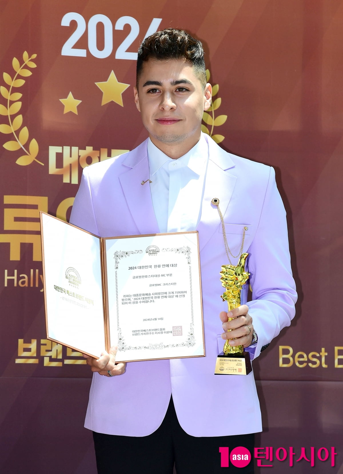 방송인 크리스티안이 14일 서울 영등포구 여의도동 국회의원회관에서 열린 '2024 대한민국 베스트브랜드 어워즈-대한민국 한류연예대상' 시상식에 참석해 포즈를 취하고 있다.