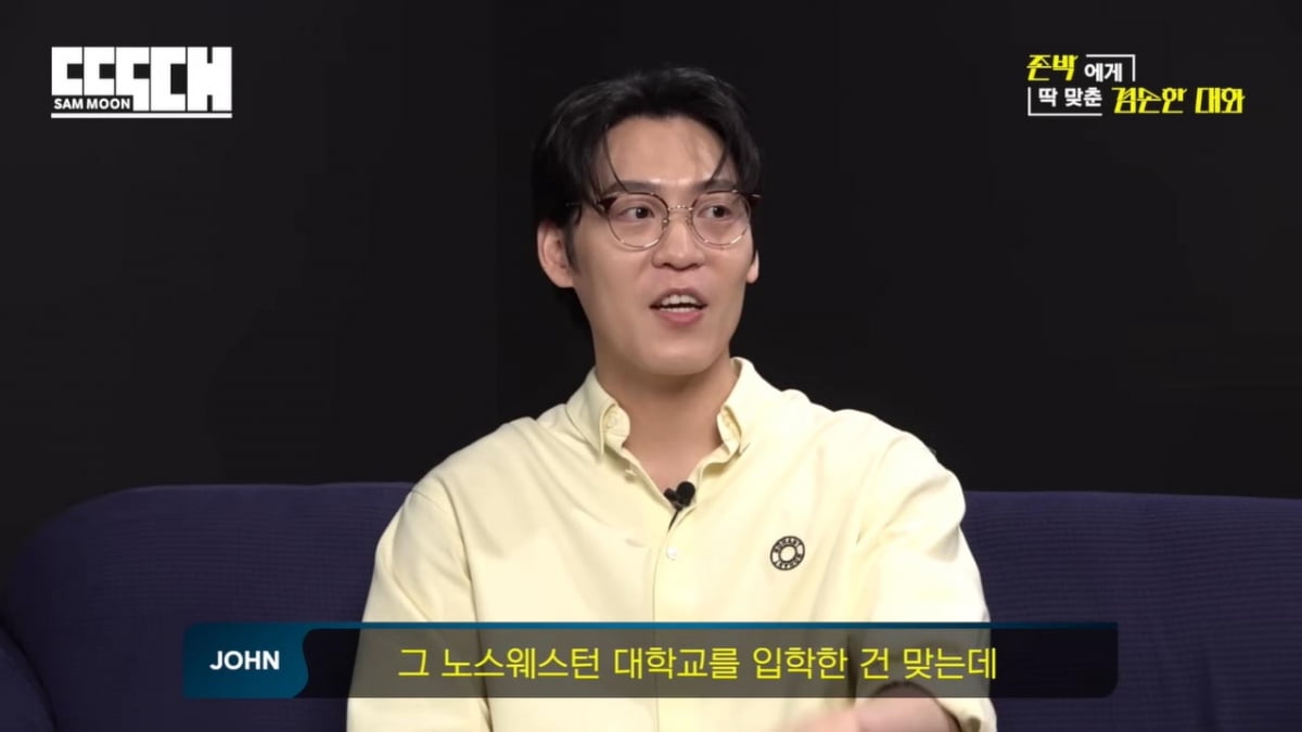 샘문은 존박에 대해 "세계 순위 11위에 달라는 글로벌 명문대학 노스웨스턴 대학교 졸업생"이라고 소개했다. 존박은 "노스웨스턴 대학교에 입학한 거 맞는데 졸업생은 아니다. 2학년 마치고 중퇴했다"라고 정정했다. 이어 "제가 학생 때 데뷔해서 가수의 길을 걷다 보니 중퇴하게 됐다"며 "(졸업) 못했다. 따지고 보면 고졸"이라고 고백했다. 이에 샘문은 "엄친아가 맞냐"라며 의문을 제기했다. 존박은 "제가 제 실력으로 입학했고 고등학교 때 공부도 꽤나 했어서 훌륭한 곳을 입학했다"고 말했다.