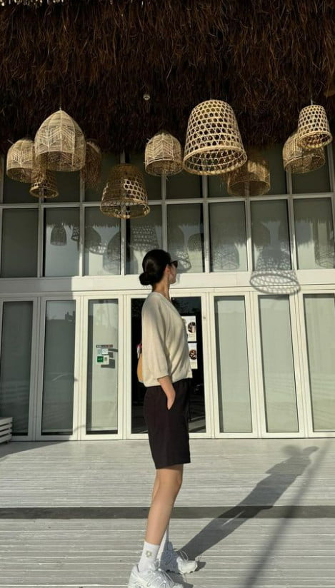 사진 속에서 김진경은 검은색 반바지에 7부 소매의 크림색 카디건을 착용한 모습. 특히 가늘고 길게 뻗은 다리와 작은 얼굴로 모델 포스를 풍기고 있어 눈길을 사로 잡는다.