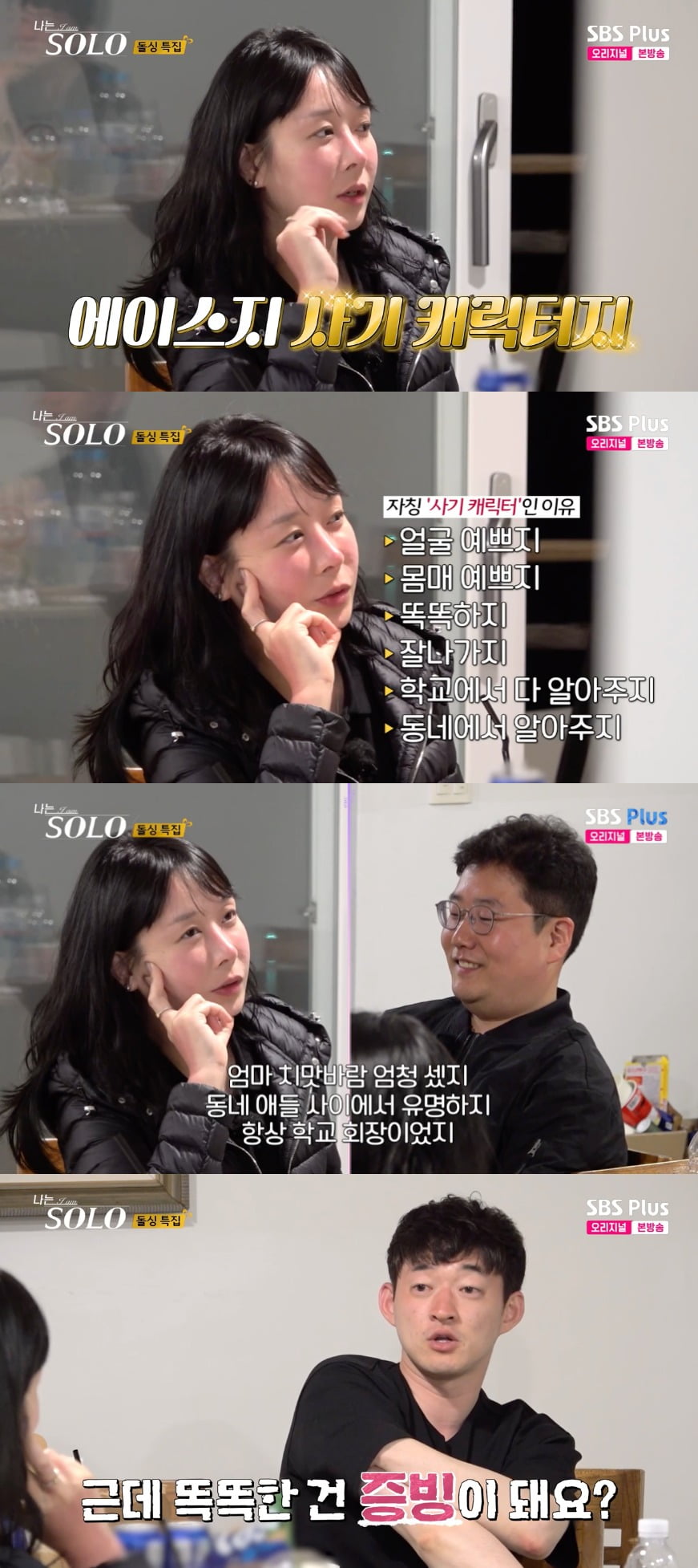 영숙의 자기자랑을 듣던 영호가 "그럼 여기에 굳이 나올 필요가 있었냐"고 묻자 영숙은 "큰물에서 모르는 사람들이랑 노는 거에는 낯을 가린다. (나는 솔로에서) 첫 만남 때 눈도 못 맞추고 그랬다"며 "학교에서 제일 잘나가는데 학교 회장이고, 공부 잘해서 똑똑한데 치맛바람 세고, 선생님들이 제일 예뻐하고 세지, 지구에서 내가 제일 세지. 천상천하 유아독존 미친 캐릭터다. 인기 정말 많고 예쁘고 몸매 정말 좋고"고 설명했다.