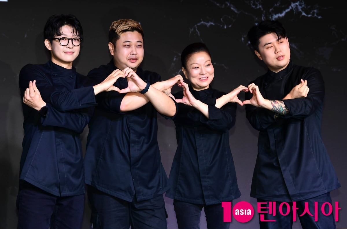 트리플 스타, 요리하는 돌아이, 이모카세 1호, 나폴리 마피아 세프가 7일 오전 서울 마포구 호텔 나루 서울 엠갤러리에서 열린 넷플릭스 <흑백요리사: 요리 계급 전쟁>의 TOP8 기자간담회에 참석해 포즈를 취하고 있다.
