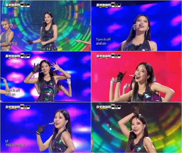 송민경은 지난 10일 방송된 MBC ON '트롯챔피언'에 출연해 지난 8월 발매한 신곡 '껐다 켜' 무대로 행복 가득한 에너지를 전했다.