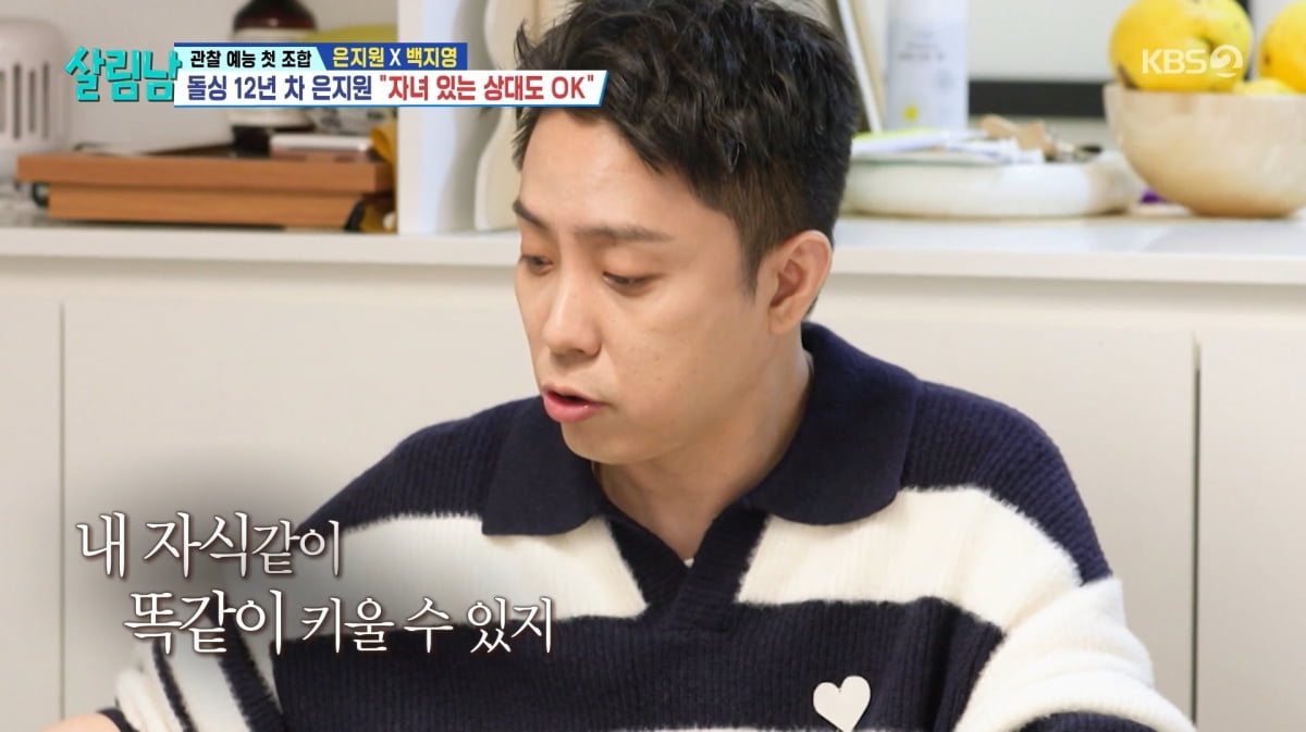"재혼 상대에게 아이가 있어도 된다"는 은지원은 "수고를 덜어주는 거잖냐. 다 큰 예쁜 아이가 있다면 내 자식처럼 똑같이키울 수 있다"고 넓은 마음을 드러냈다. 그러면서 "결혼이 더 늦어지면 혼자 살아야지, 실버타운 좋은데"라며 너스레를 떨었다.