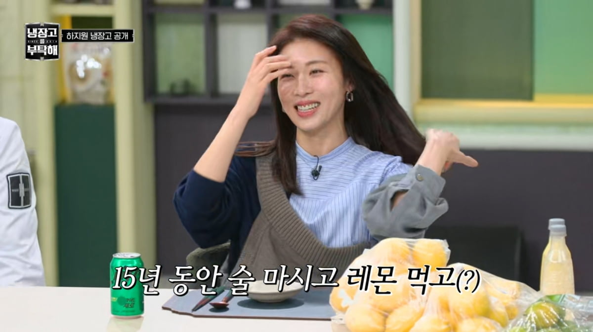 냉장고에는 레몬이 가득했고 라임도 있었다. 레몬즙도 있었다. 하지원은 레몬을 15년 동안 먹고 있다고 밝혔다. 병에 든 레몬즙에 대해 "소주에 레몬을 타서 마시면 다음날 부기도 없고 숙취도 없다"며 "내가 자주 먹으니까 엄마가 한 번에 2~3병씩 짜놓는다. 텀블러에 꿀을 타서 마시기도 한다"고 말했다.