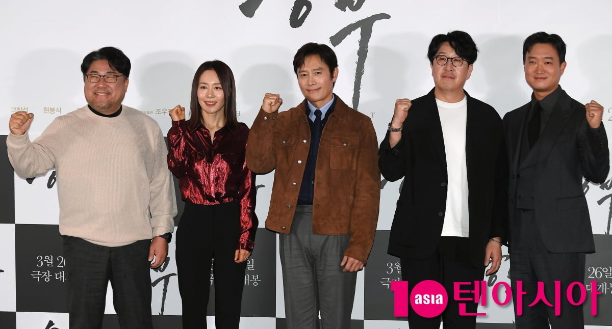 배우 이병헌, 고창석, 현봉식, 문정희, 조우진이 19일 서울 용산구 CGV 용산아이파크몰에서 열린 영화 '승부' 언론시사회에 참석해 포즈를 취하고 있다.