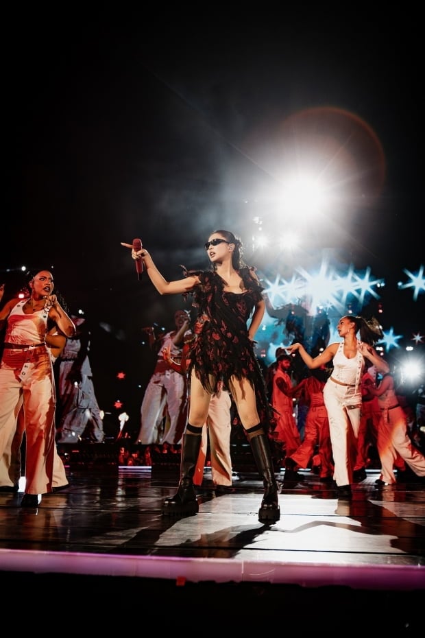 이날 제니는 맥퀸 2026 봄/여름 컬렉션 제품인 워시드 카키 코튼 트윌 소재의 봄버 재킷에 골드 프로깅 자수 장식과 썸머 플로럴 자카드 소재가 돋보이는 미니 스커트를 매치해 감각적인 룩을 완성했다.