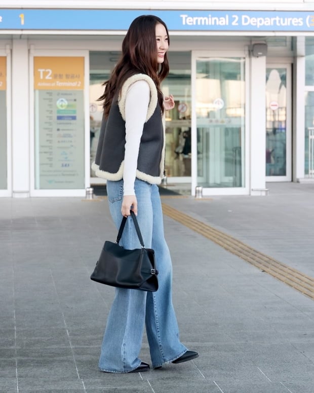 이날 정수정은 소프트한 메리노 시어링 소재 디테일이 들어간 레더 베스트와 캐시미어 크루넥 스웨터를 매치해 포근한 무드를 연출했고, 미드 라이즈의 릴렉스 와이드 레그 실루엣의 데님팬츠를 착용해 깔끔한 스타일을 완벽 소화했다. 여기에 유니크한 쉐입이 돋보이는 숄더백을 들어주며 럭셔리한 공항패션의 정석을 선보였다.